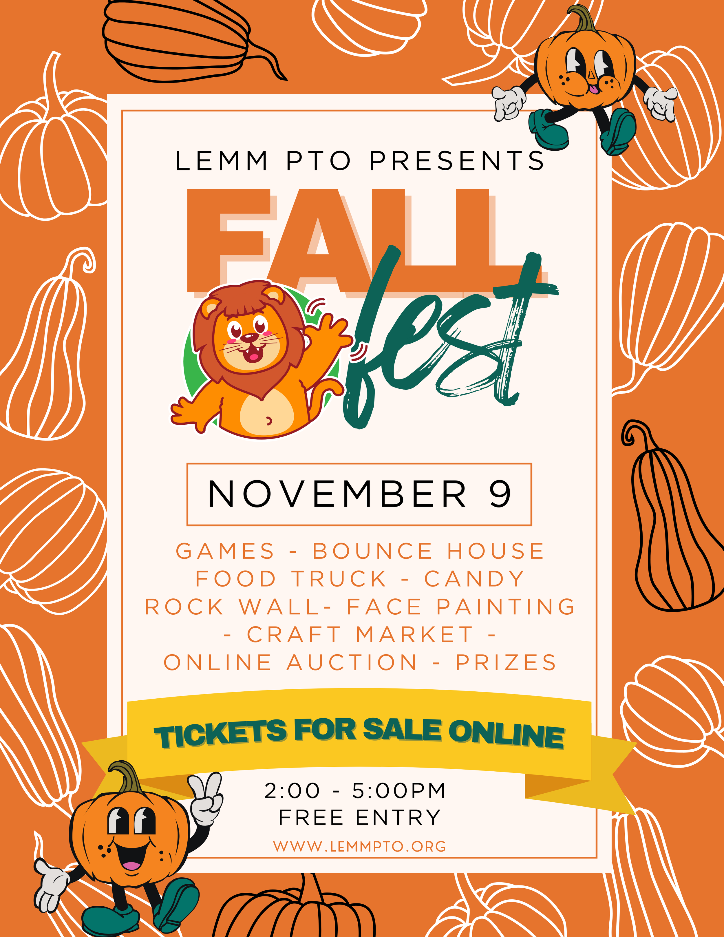 Get ready for the highlight of the year—Lemm PTO's Fall Fest! This family-friendly extravaganza features a day packed with fun. Kids can test their skills with carnival games, conquer the rock wall, and families can score great finds in our online auction. Don't forget to indulge in delicious treats from our food truck! Join us for a day of joy and community spirit while supporting our biggest fundraiser of the year. Mark your calendars and bring the whole family for an unforgettable day!