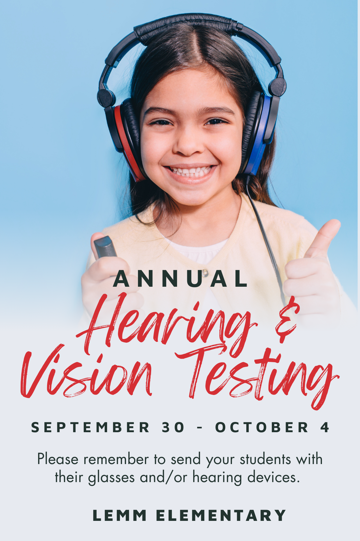 Hearing & Vision Exams Monday, September 30, 2024 11:00 AM Friday, October 4, 2024 12:00 PM 19034 Joanleigh Drive Klein, TX (map) Google Calendar ICS It's time for our annual hearing and vision testing! Please make sure your student brings their glasses if they wear them to ensure accurate results. Thank you for helping us keep our students' health in check!